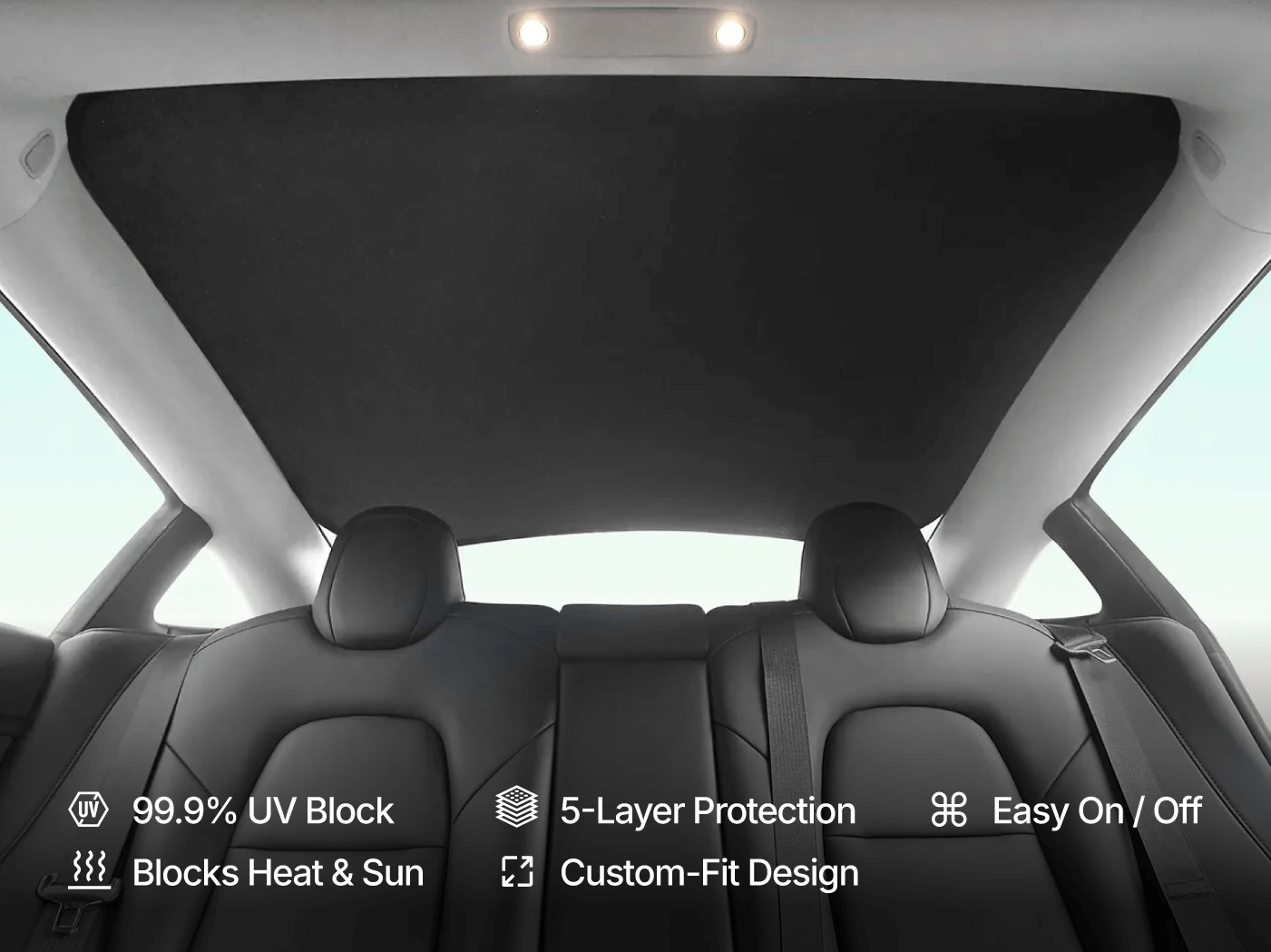 Blocks harsh sun and 99.9% of UV to reduce heat buildup. Custom-fit for Model Y with a clean, gap-free look.sily