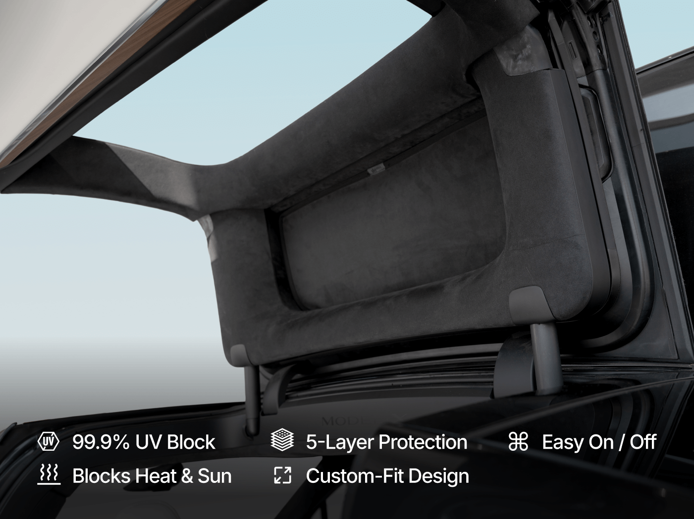 Blocks harsh sun and 99.9% of UV to reduce heat buildup. Custom-fit for Model Y with a clean, gap-free look.